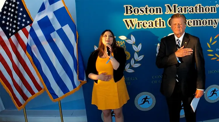 The talented Zoe Behrakis performs the national anthems of Greece and the United States at the Boston Marathon Wreath Ceremony held by the 26.2 Foundation, the Alpha Omega Council, and the Greek Consulate General of Boston at the View Boston.